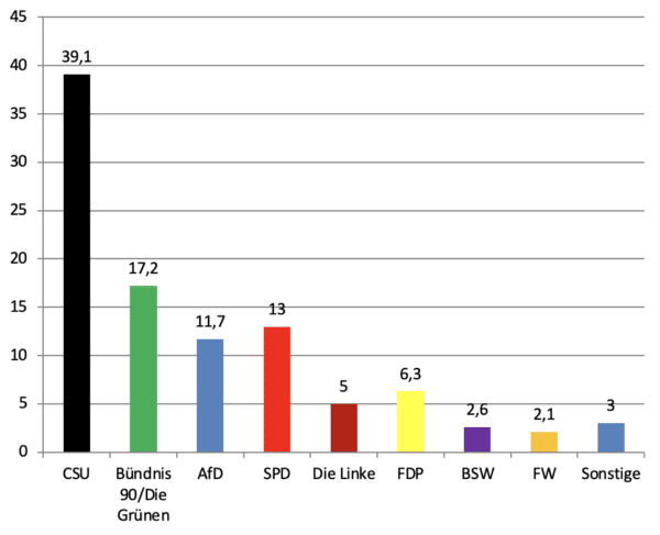 Überholt wurden die Sozialdemokraten von den Grünen, die vergleichsweise geringe Einbußen erlitten und mit 12,0 Prozent knapp vor den Sozialdemokraten drittstärkste Kraft im Freistaat wurden. «Viele hatten größere Sorgen vor dem heutigen Abend», sagte im BR der Grünen-Bundestagsabgeordnete Toni Hofreiter. In den Umfragen vor der Wahl hatten die Grünen zwischenzeitlich noch erheblich tiefer gelegen. Die Grünen verloren jedoch auch ihr einziges Direktmandat im Münchner Süden: Dort unterlag die dort 2021 gewählte Grünen-Abgeordnete Jarmila Schäfer der CSU-Kandidatin Claudia Küng.