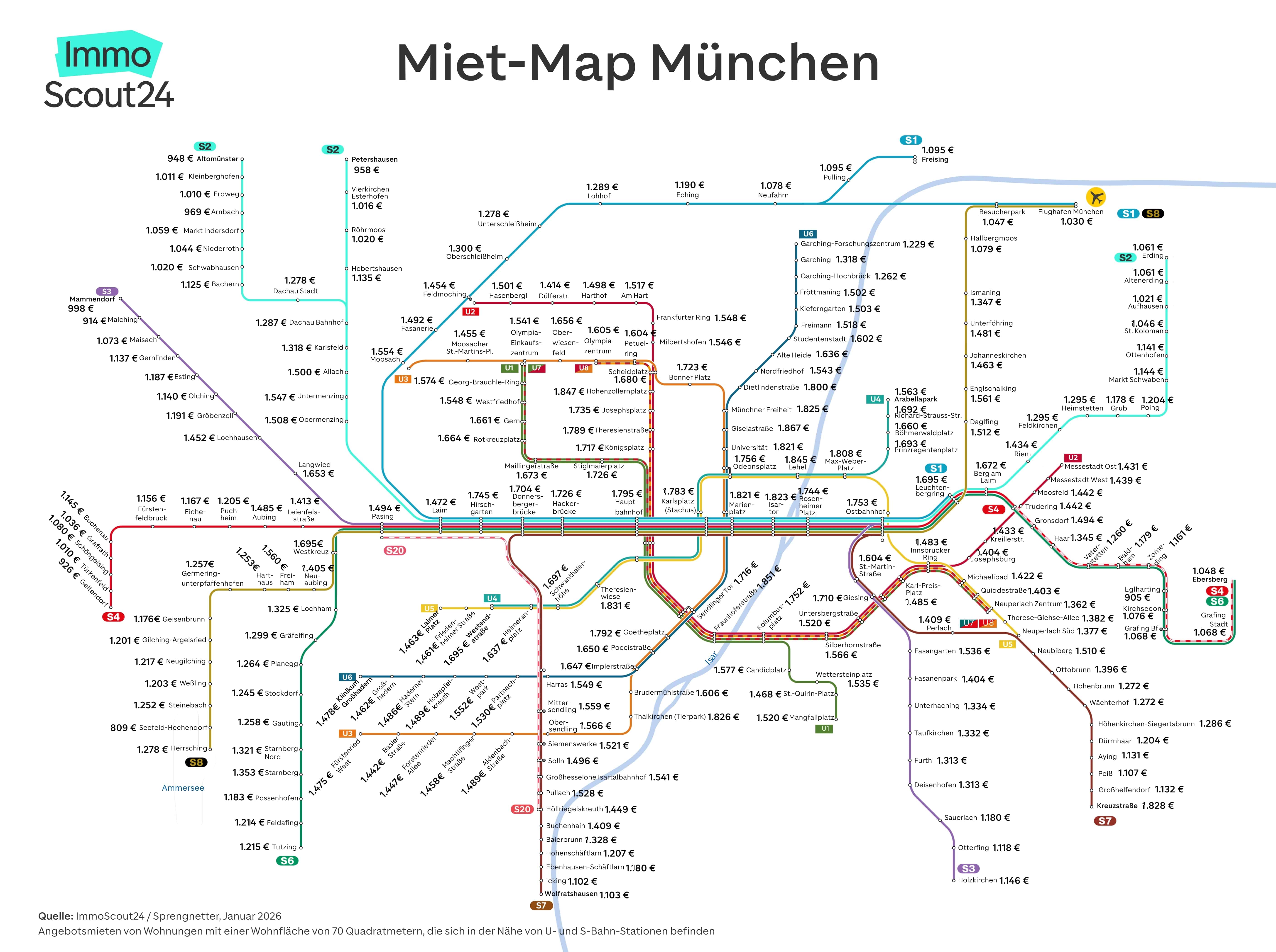 Immobilienscout24 hat für 2026 eine besonders anschauliche Mietkarte veröffentlicht: Die Angebotsmieten wurden nicht nach Stadtvierteln, sondern nach U-Bahnstationen aufgeschlüsselt – also dort, wo Menschen tatsächlich wohnen und pendeln. Damit ergibt sich ein realitätsnahes Bild für Wohnungssuchende, die entlang ihrer Strecke überlegen: Wo lohnt sich ein Umzug? Wo ist es (noch) bezahlbar?